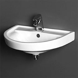 Tyvärr så är detta handfat för grunt för att passa till någon pelare eller kåpa. De två extrahålen knackas ut av installatören. Tvättstället är förberett för trehålsblandare. Destod vid löpandebandet ochlastade handfat för att fåråd till en Londonresa.